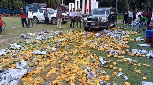 বৃহস্পতিবার বিকেলে সাতক্ষীরার দেবহাটা ফুটবল মাঠে জব্দকৃত আম বিনষ্ট করা হয়।