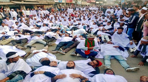 শনিবার (২৭ ডিসেম্বর) বিকেলে দলটির কয়েক হাজার নারী ও পুরুষ সমর্থক কাফনের কাপড় পরে মণিরামপুর বাজারের প্রধান সড়কে অবস্থান নিয়ে বিক্ষোভ মিছিল ও সমাবেশ করেছে।